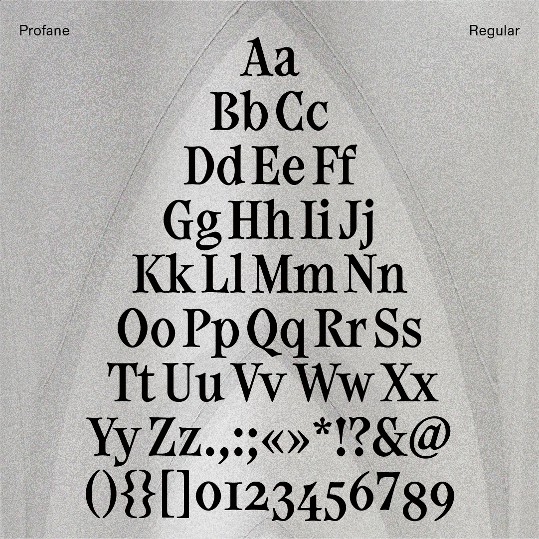 Rooted in gothic tradition, Profane evokes a modern interpretation of 14th-century inscriptions found in the Metz Cathedral (France). Blending angularity and softness, this display typeface preserves the medieval spirit with gargoyle-like terminals and diamond-shaped counterforms while adding a melted quality with rounded serifs and gooey ligatures. A striking graphic tension that grants distinctive and expressive texture to your scriptural needs.