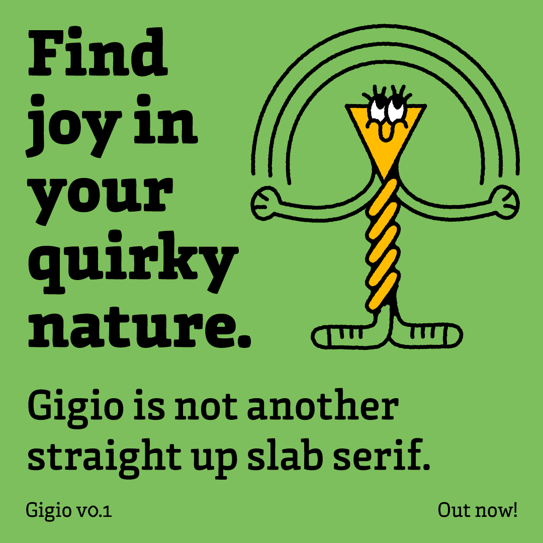 Gigio was born in Argentina—as Ana Laydner's graduation project at CDT-UBA in Buenos Aires—and raised in Brazil. A friendly yet strong slab serif, inspired by comic books, that welcomes all kinds of narratives. Combining a mechanical structure with calligraphic strokes and rather condensed proportions, the 5-weight family (from Book to Extrabold) works nicely in text, while uncovering quirky details in larger settings. Version 0.1 has uprights only, but italic companions are coming next.